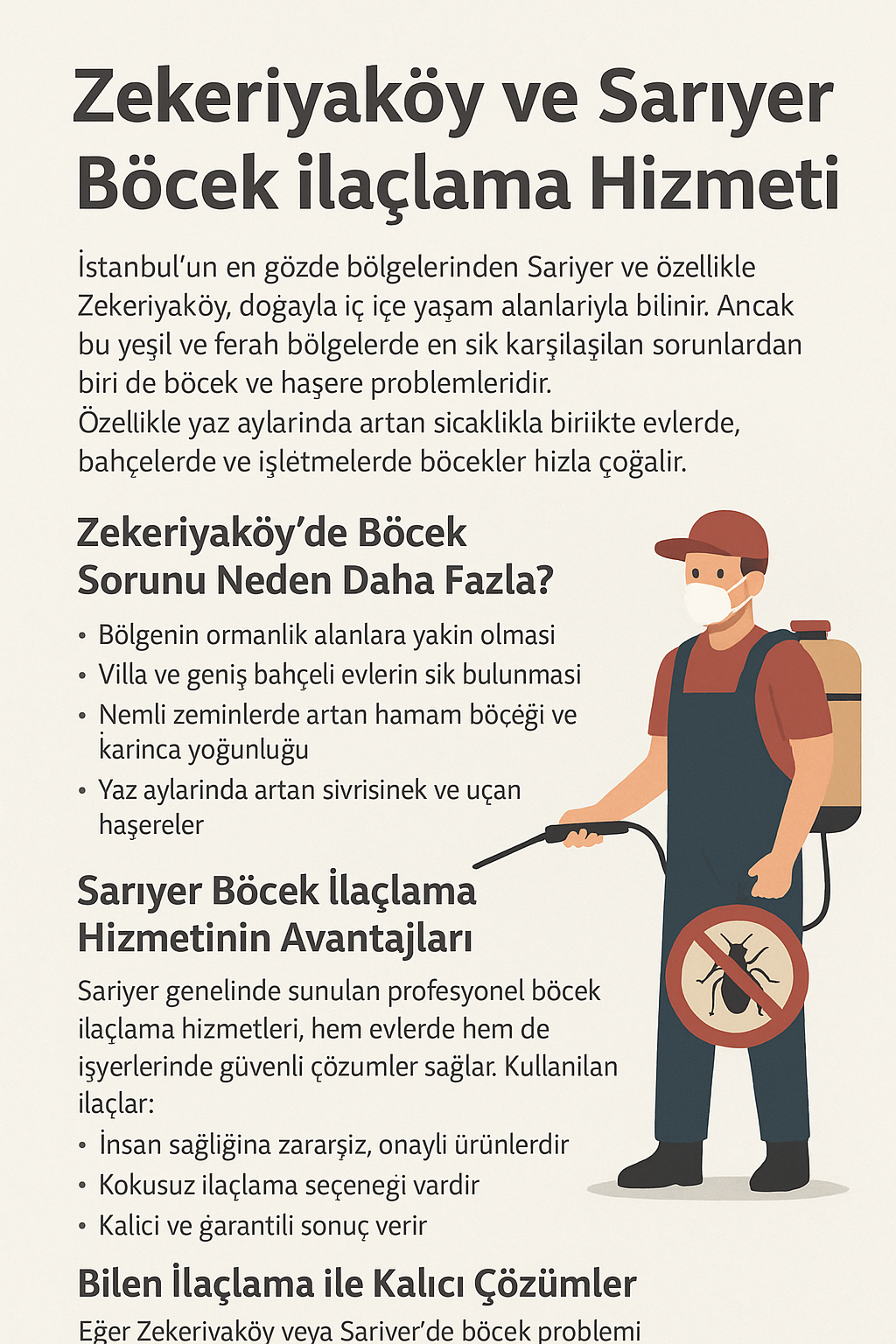 İstanbul’un en gözde bölgelerinden Sariyer ve özellikle Zekeriyaköy, doğayla iç içe yaşam alanlarıyla bilinir. Ancak bu yeşil ve ferah bölgelerde en sık karşılaşılan sorunlardan biri de böcek ve haşere problemleridir. Özellikle yaz aylarında artan sıcaklıkla birlikte evlerde, bahçelerde ve işletmelerde böcekler hızla çoğalır.